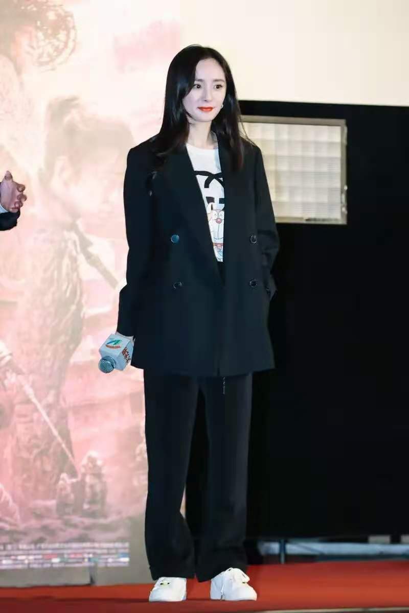 西服自带正式感,通常被大家当做职场装来穿,其实,我们也可以像杨幂这样,选择宽松程度适中的H型西服版型,再搭配T恤、休闲裤这类休闲单品,也是可以赋予西服休闲感,把它当成通勤装来穿。