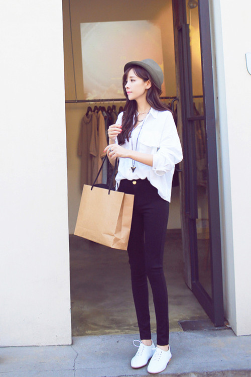 要点:韩式的搭配哲学就是“宁瘦毋滥”,每一个细节都做到显瘦美观,增加搭配的魅力和风格,为服装加分不少,而且白色的衬衫采用小立领更加迷人,搭配修身的铅笔牛仔裤,为搭配加分不少。