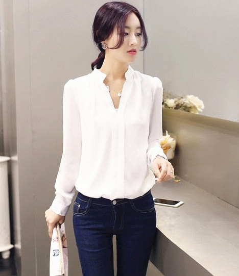 以瘦为美首先体现在白衬衫的款式上,修身的立体肩,紧窄的腰部设计,整体没有宽松感,而且搭配收腰设计,比较显瘦,解决了衬衫领角的臃肿问题。