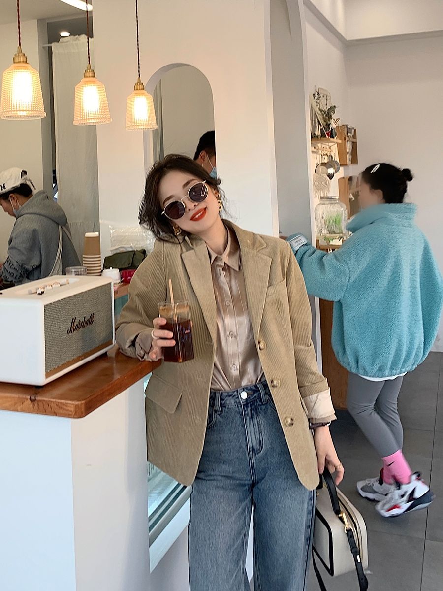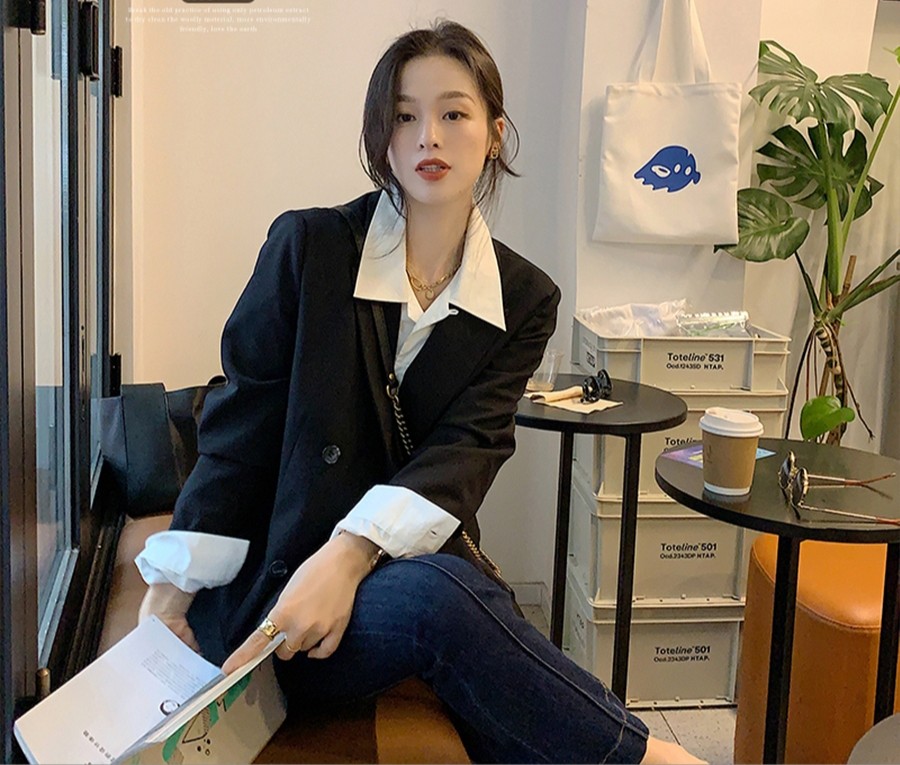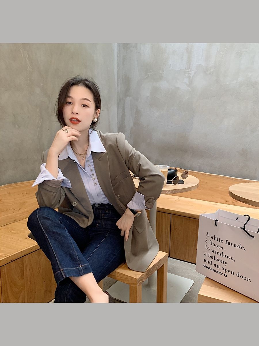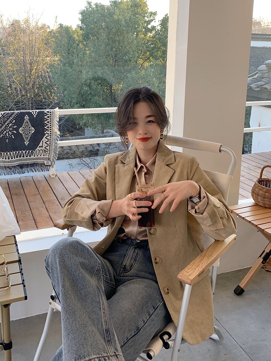 穿西装外套的时候,版型可以修饰身材线条感,内搭的时候选择像这种有领子的衬衫可以把层次感提升到最高,穿出来的身型也会更加的完美。