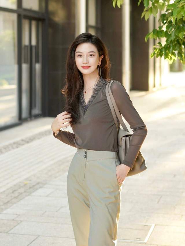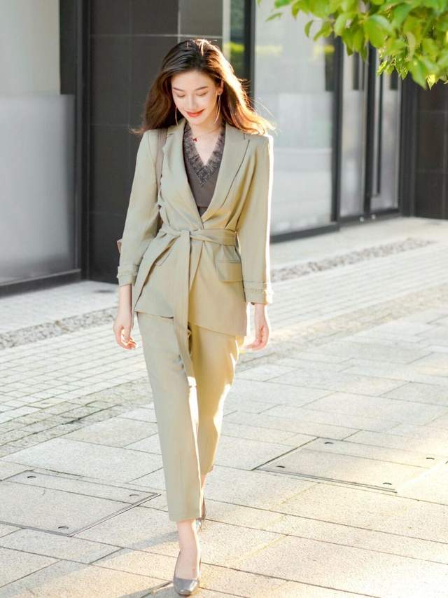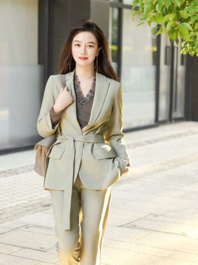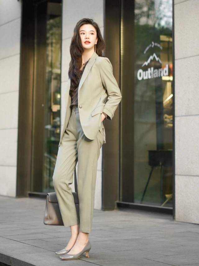 同样是秋天的职场穿搭,那么这位穿搭博主选择了一套浅绿色的西装套装。内搭一件蕾丝边的V领上衣,V领的设计不仅能够修饰锁骨的线条,而且还很显脸小。