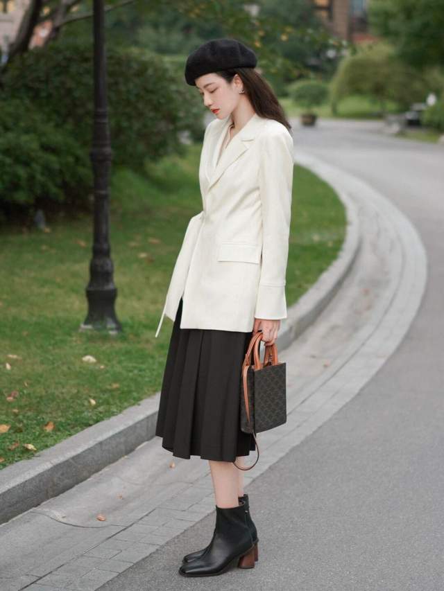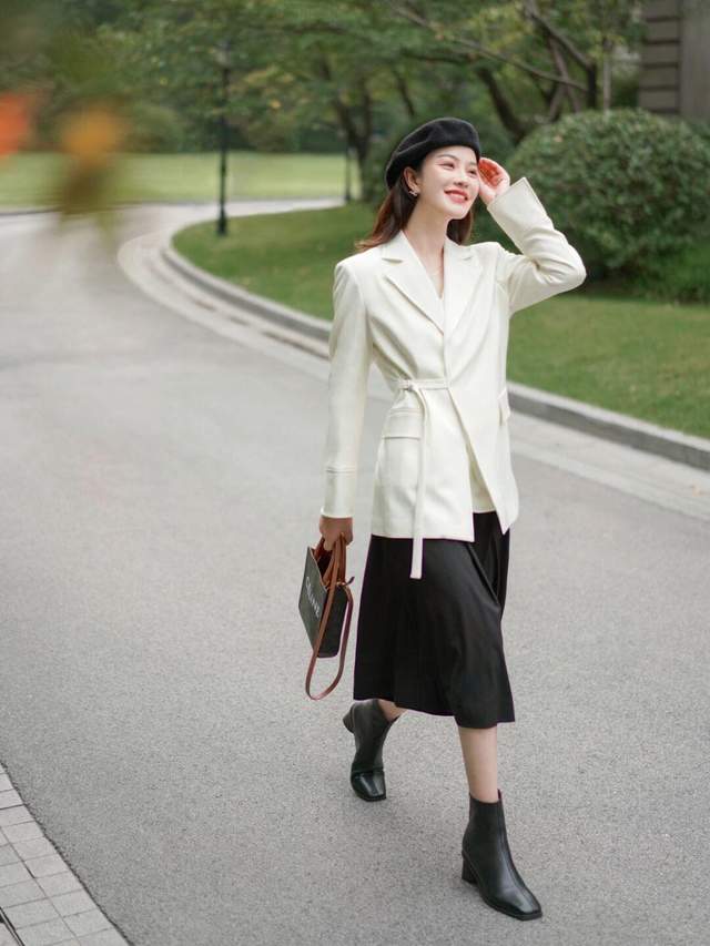 早秋穿的话,可能天气会有一些冷,你还可以搭配一件白色的西装外套,这件外套是有一点点垫肩的款式,穿起来更加的硬朗有版型。而且腰部还有一个收腰的设计,系起来更加的显瘦又能够拉长整个人的身体比例。