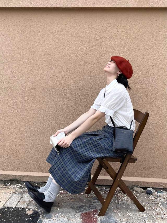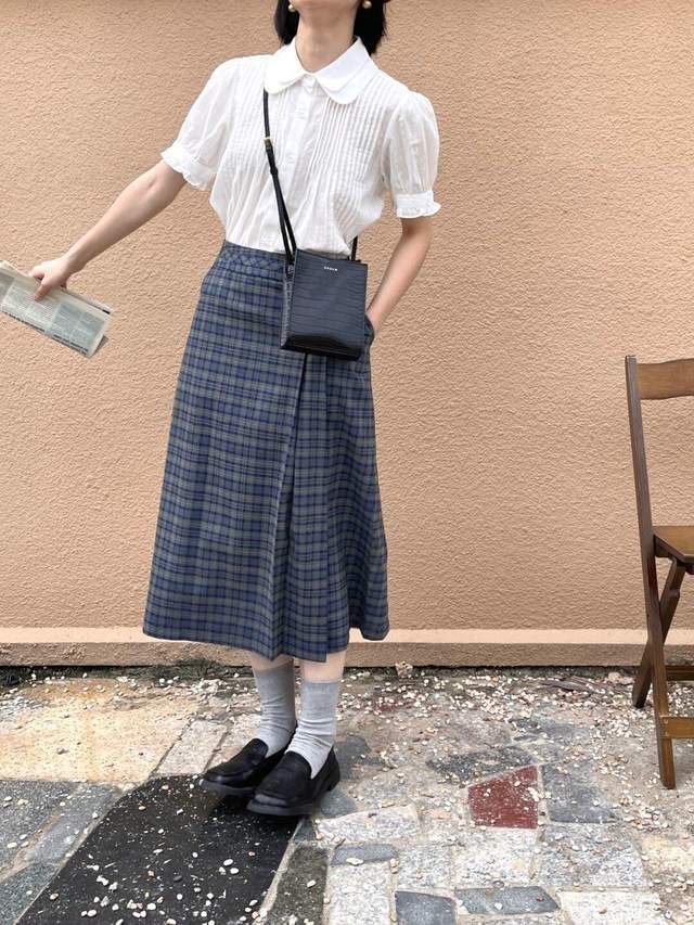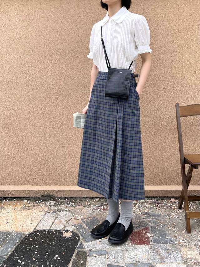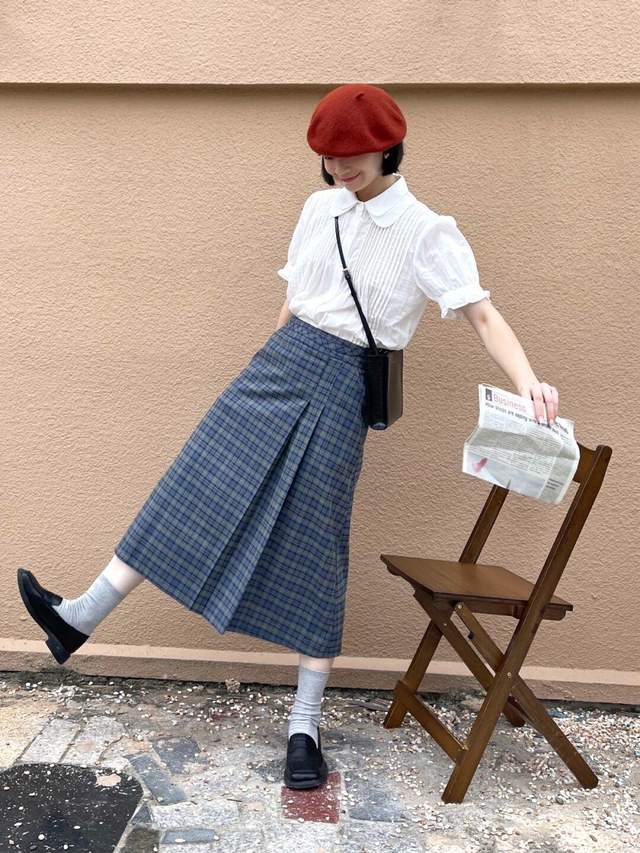 下半身搭配的是一条格子的半身裙,这条裙子长度在膝盖以下,秋天穿的话也不会很冷,保暖又舒服。如果你觉得冷的话可以穿一条打底裤或者是丝袜会更加的保暖,白色搭配深色可以说是简约又高级的配色。