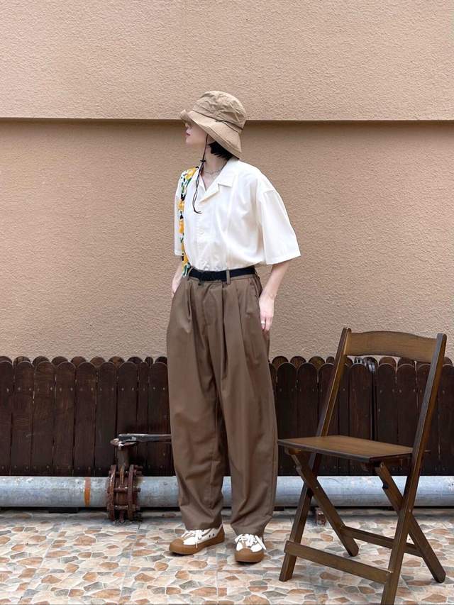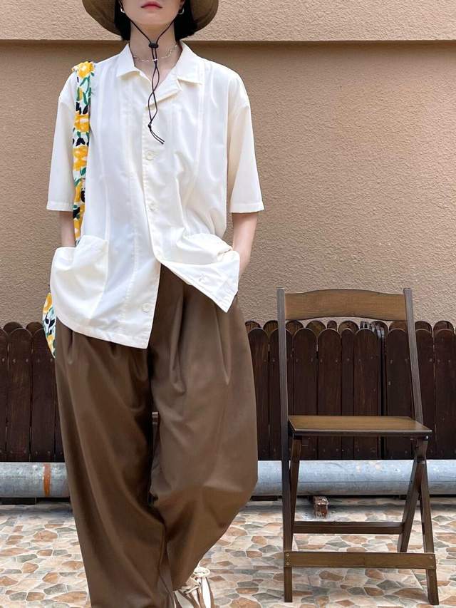 基础版型的衬衫也能够搭配出高级感,就像这位穿搭博主搭配的一样,上衣选择了一件V领的中袖的衬衫+褐色的宽松休闲裤,整体搭配起来高级感满满,而且这样的高级穿搭不挑场合,怎么穿都不会出错。