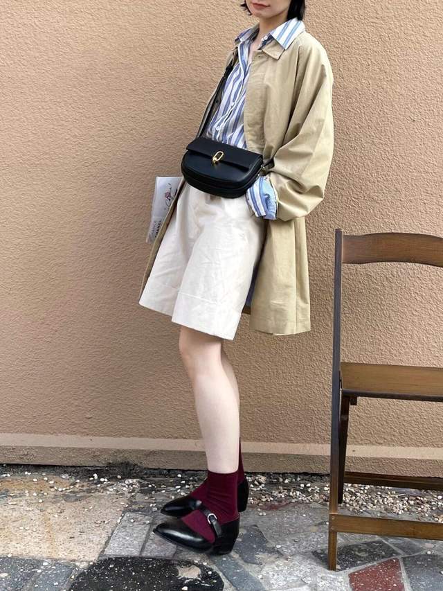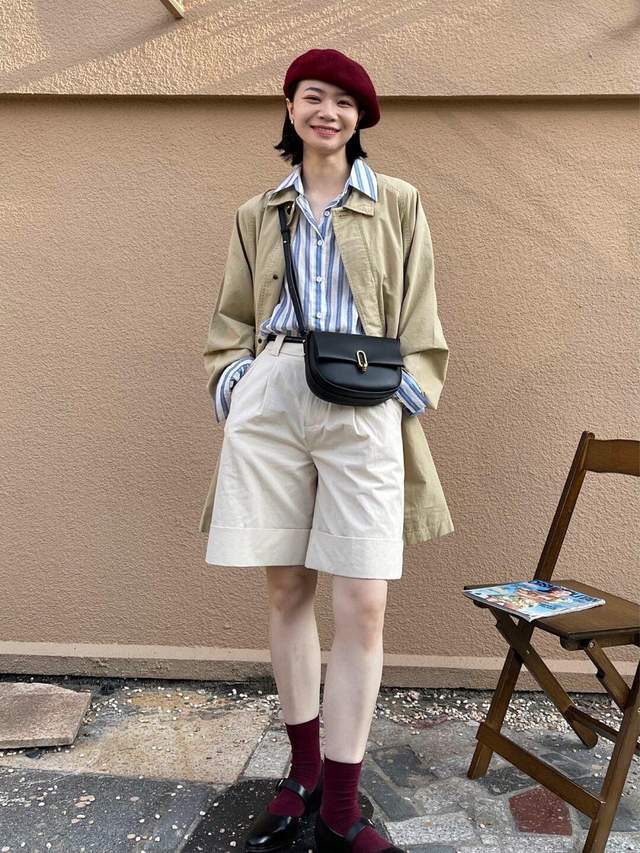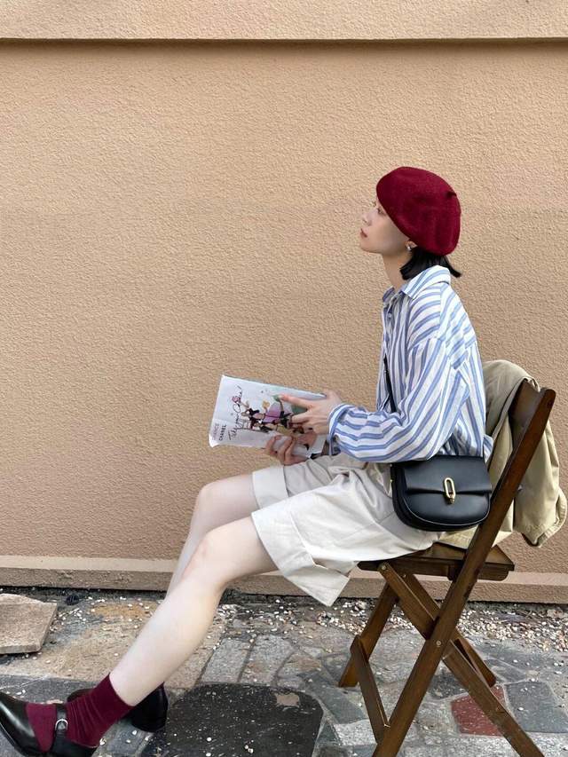 如果你不知道怎么搭配那么你可以参考这位穿搭博主是怎样搭配的,或许能够给你提供一些搭配灵感。她上衣选择的是一件蓝白竖条纹的衬衫,这种颜色估计不会有人去尝试吧!虽然穿起来就像病号服,但如果你配色搭配的很好,就能够搭配出高级感。
