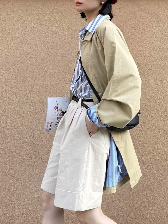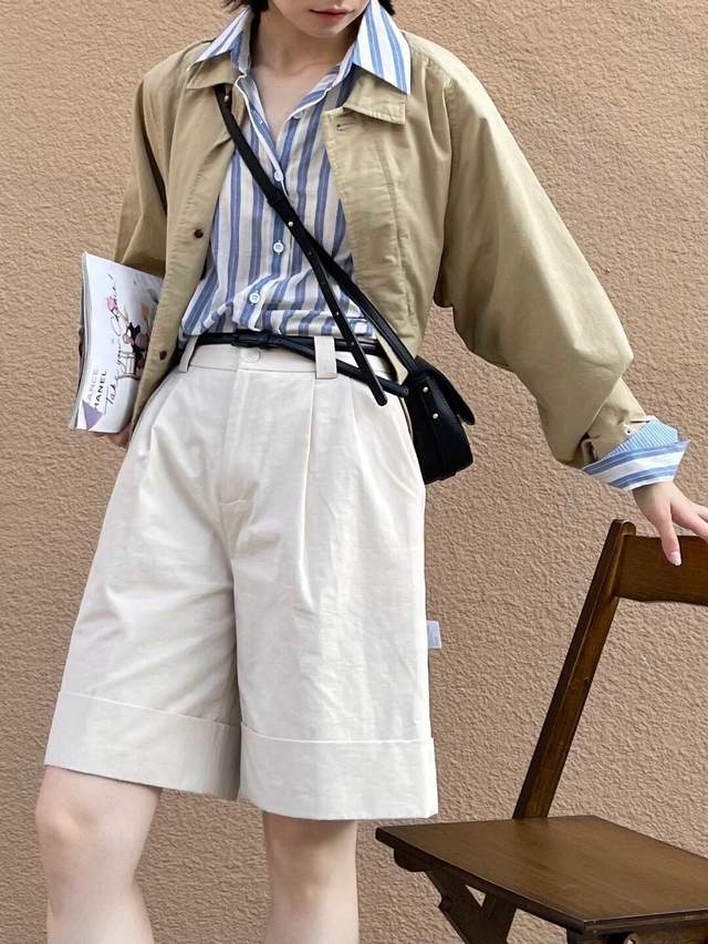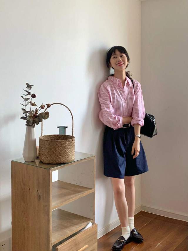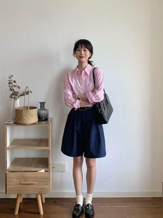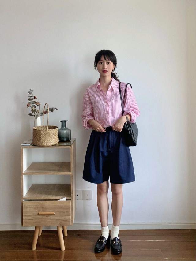 同样是衬衫的搭配,那么这位穿搭博主选择了一件粉红色的条纹衬衫➕一条深色的宽松短裤,搭配起来有一种韩剧女主的感觉!