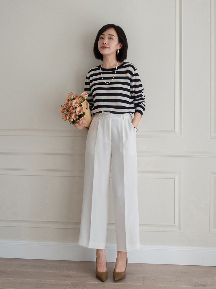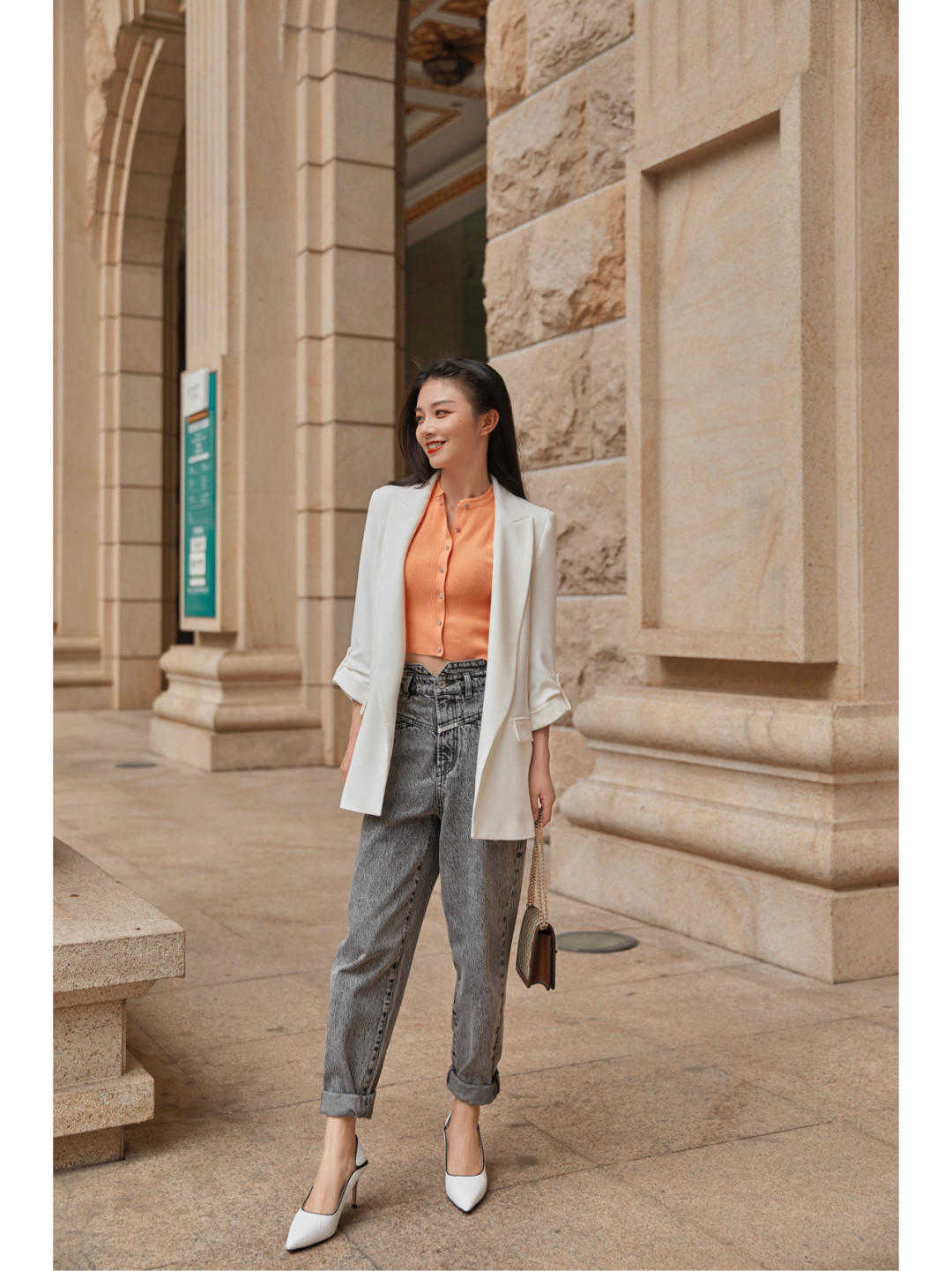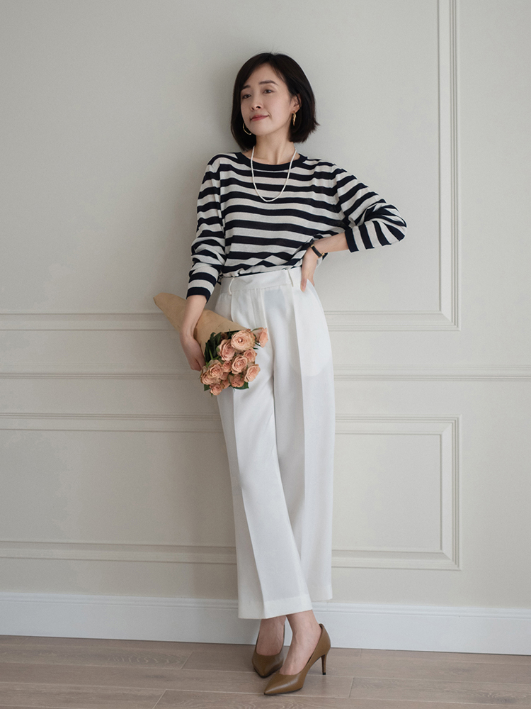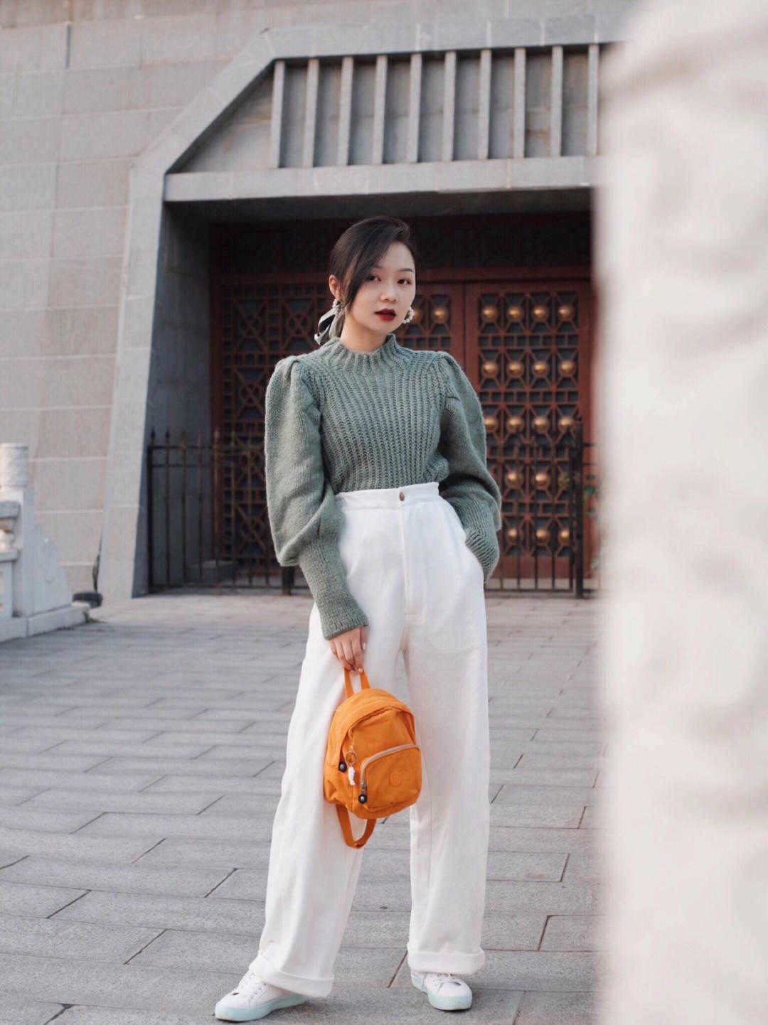 不过在南方这样穿搭应该是比较适合,广州、深圳这样的南方城市还是比较热的,但是在北方城市,早晚上下班还是有点凉,那么你就可以选择针织毛衣,下面这套穿搭很不错,搭配得也非常好;也是用白色的裤子进行搭配,不同的是它采用了阔腿裤的设计感。
