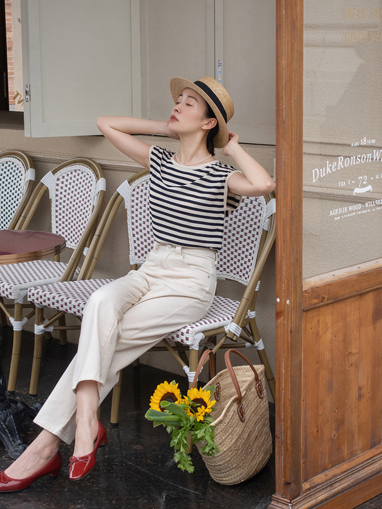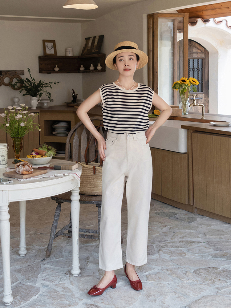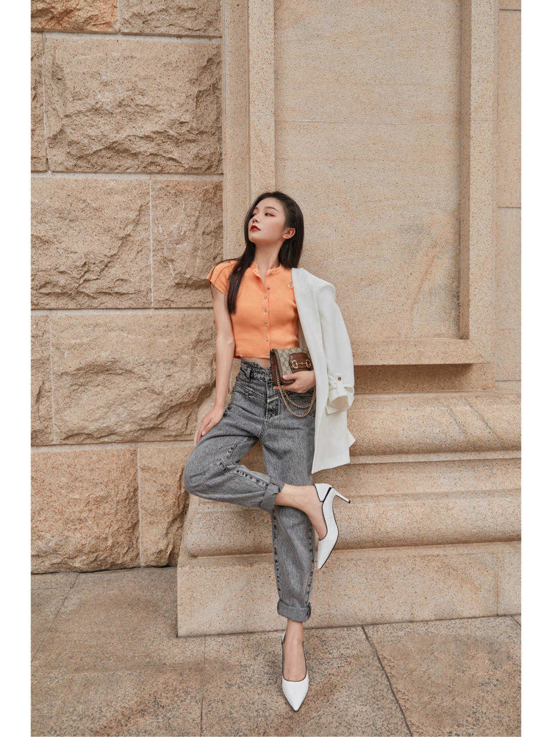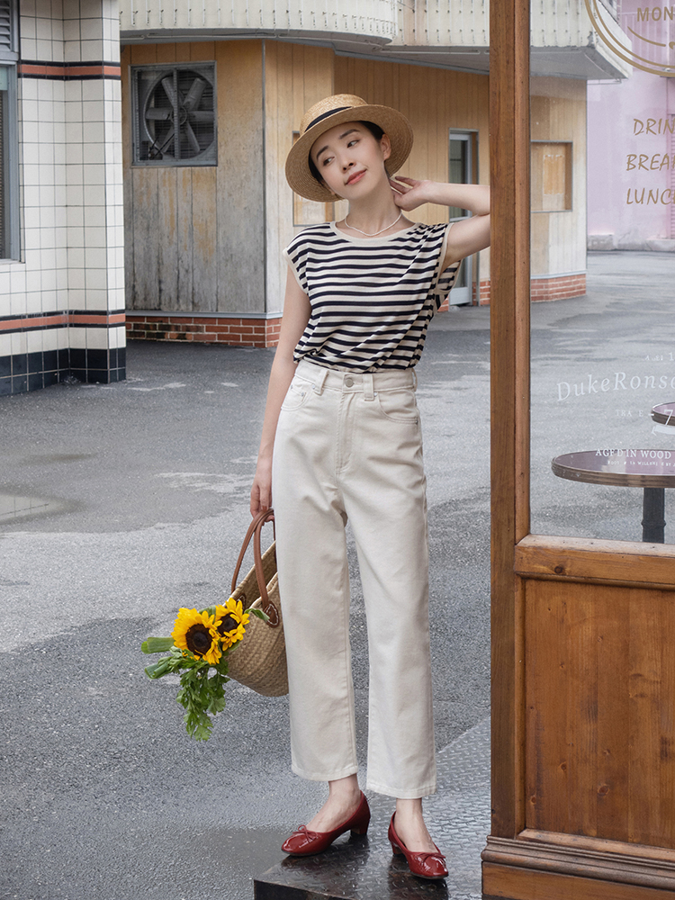 纯色系列的衣服裤子最好搭配了,像这条简约基本款水洗直筒牛仔裤,和无袖条纹衬衫搭配,显得非常的减龄洋气,就算是奔三奔四的年纪穿搭了,也要年轻个10岁不止,高腰浅色棉质九分裤设计,很是个小个子女生穿搭,显高又纤瘦。