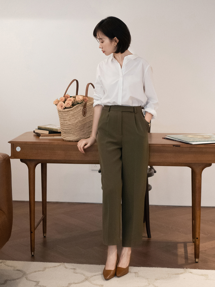 虽然很多的小个子可能不够自信,甚至是不知道怎样搭配出比较好看的服装和造型,其实我们也不必自卑,能够穿搭出很好的感觉,也是我们每一天都要去学习和追求的东西。像下面这套穿搭就非常的干练,一件白色的衬衫搭配上墨绿色的阔腿裤,依然很fashion,显高显瘦,超级好看。