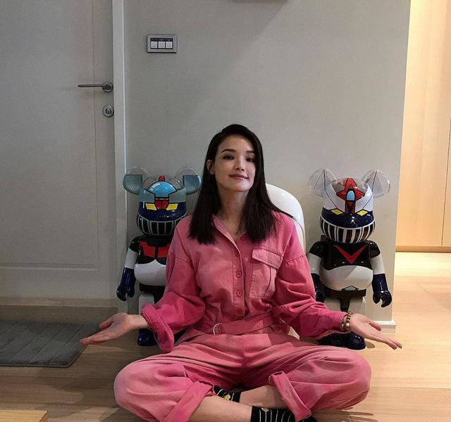 在家中搞怪的舒淇充满活力,一身粉红色的连体裤让舒淇带着一种男孩子的顽皮感。粉红色没有让舒淇过于甜腻,反倒工装的质感让她多了几分硬朗的风格。腰部带着腰带的设计让舒淇坐着都能富有曲线。最后套一双条纹卡通的袜子,真是少女心满满的大姐姐。