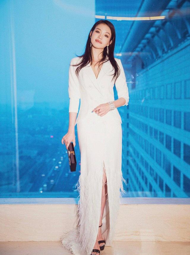 舒淇这身套装真是太有女神范儿了,特别是上身的白色小西装修身又紧致,还能用大v领来衬托舒淇自带的性感。下身穿一件流苏裙装,裙摆的鱼尾流苏让舒淇站着都有一种摇曳的飘逸,配合手上和耳畔的闪亮装饰,让舒琪带着一种精致大女人的霸气。