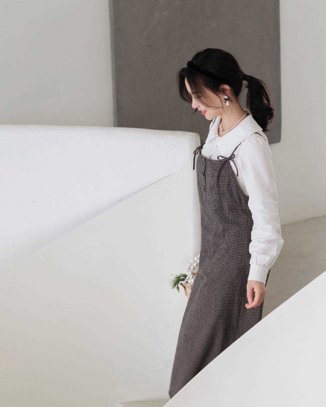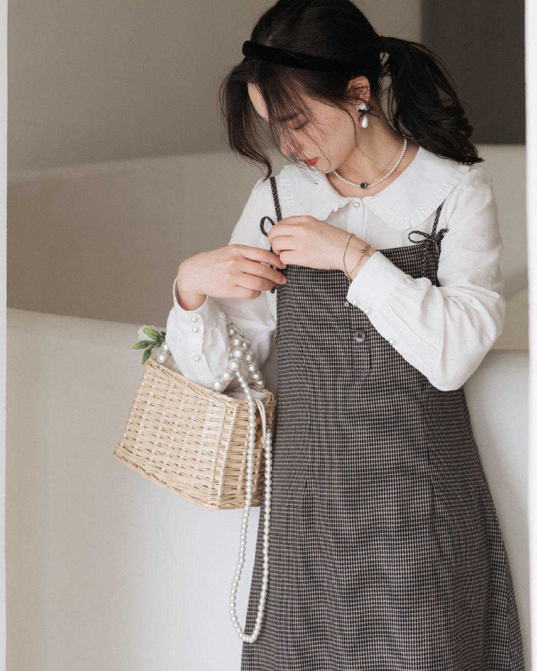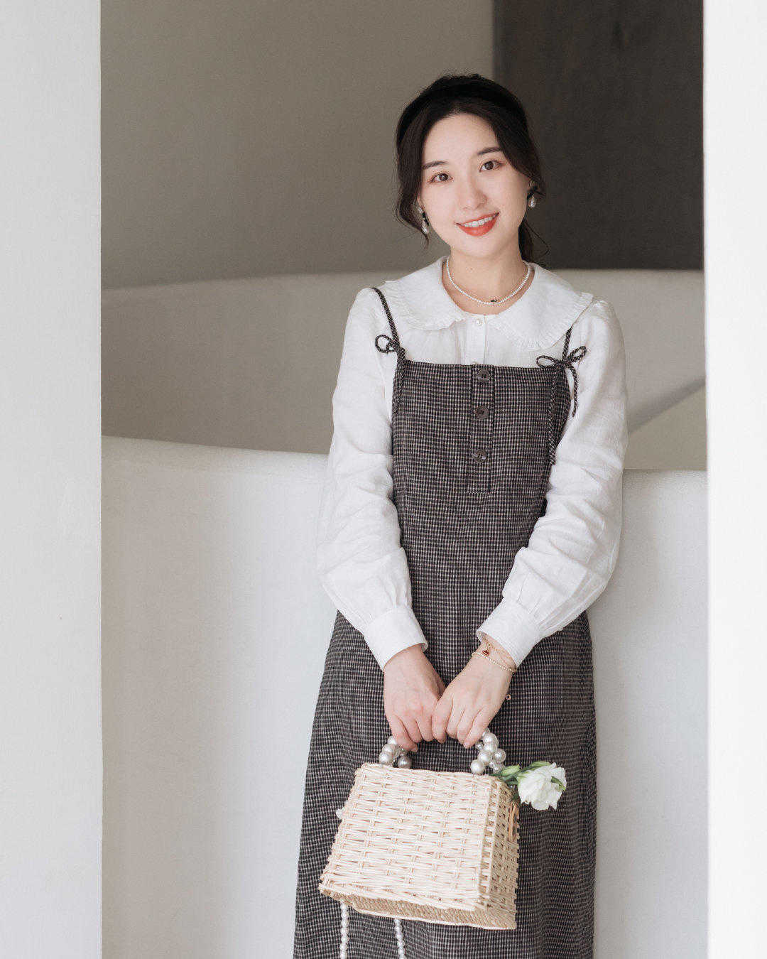 所以这样整体的穿搭,也会显得格外的时尚,甚至还有一个穿搭方法和技巧,就是像这位时尚博主这种,除了把衬衫当成外套穿,我们甚至还可以把衬衫切换成披肩,也可以是一种搭配方法,也会变得很清纯又很小清新。