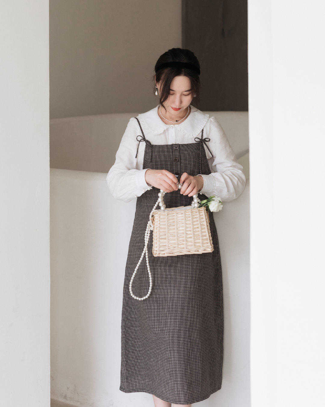 所以不要把衬衫藏起来,我们可以这样来穿搭,这样穿搭又有一种特别成熟的感,还有一种一看就想要入手的感觉,特别是选择的包包,也非常的符合整体的造型和穿搭。