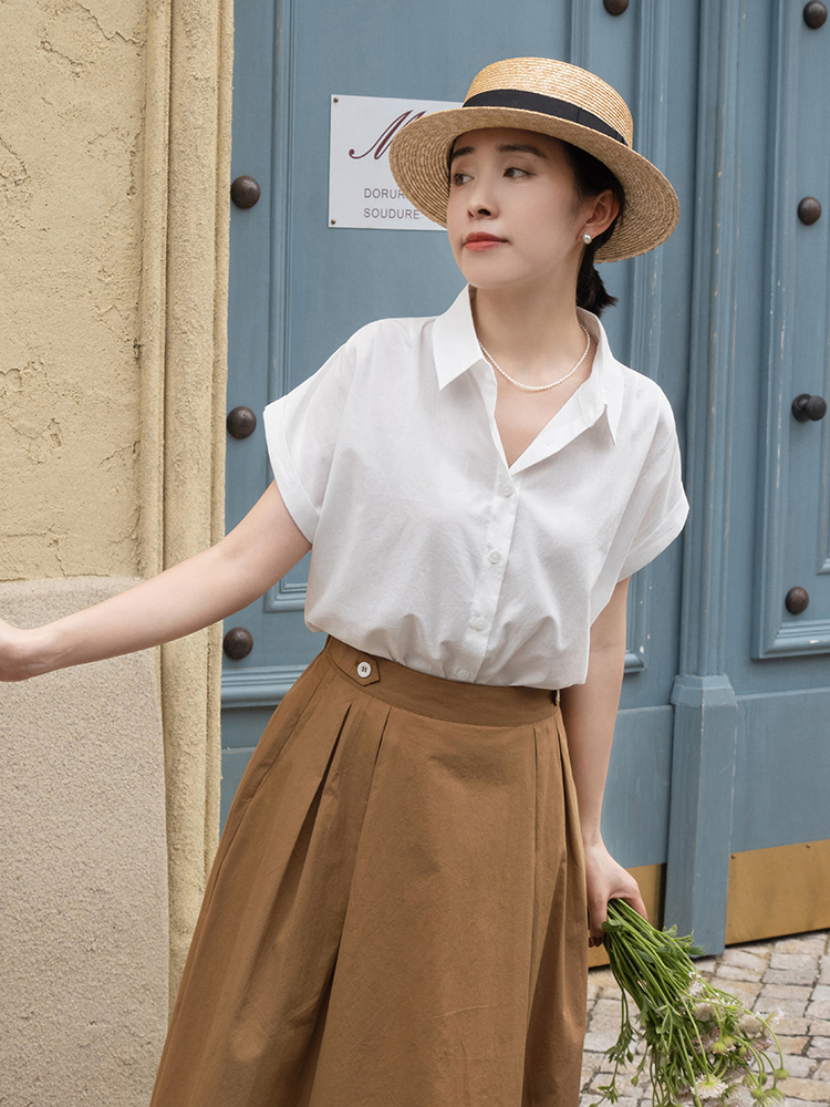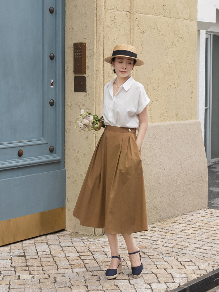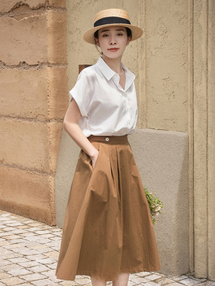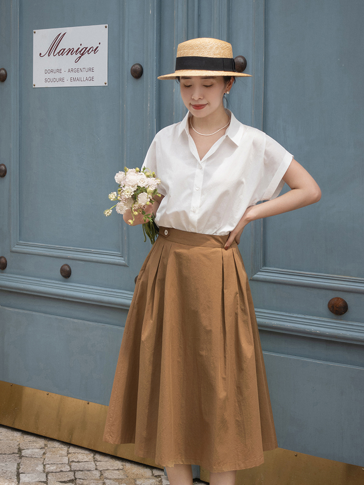 然后选择棕色的A字半身裙,布料还非常挺括,没有那么柔弱,但却很立体,还有一种内在的时尚,直接把所有衬衫的衣角全部都塞进裙子里就好了,提升了腰线,更加显高显瘦,又自带一股温馨厚重的感觉,对于下半身曲线不够完美的女生来说也可以完美修饰。