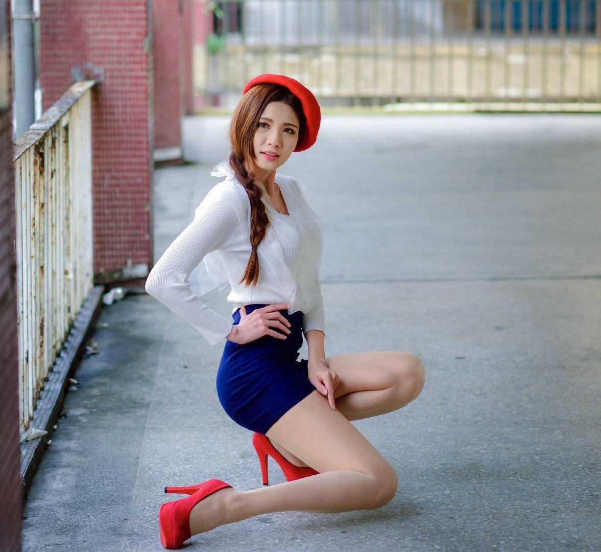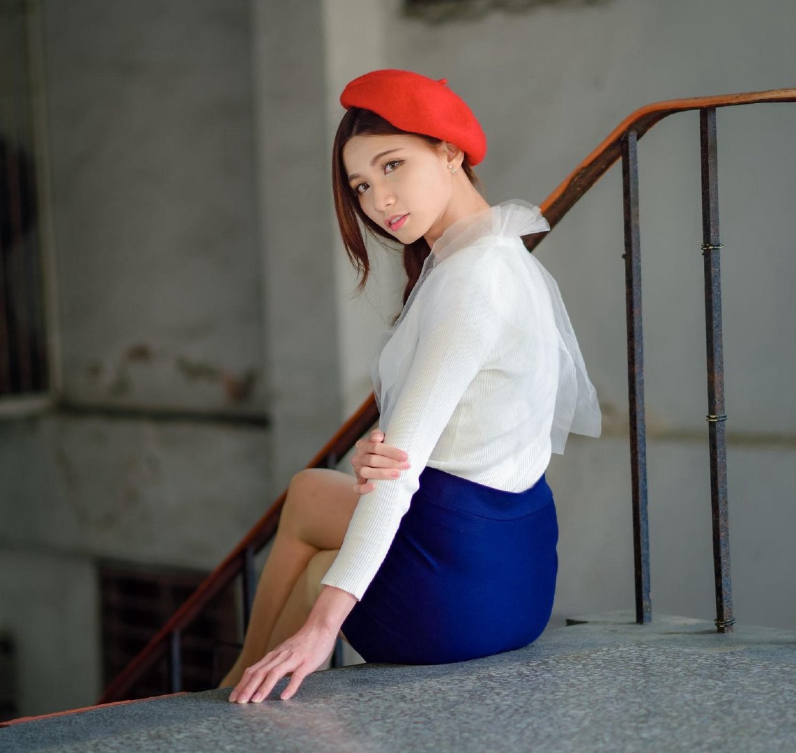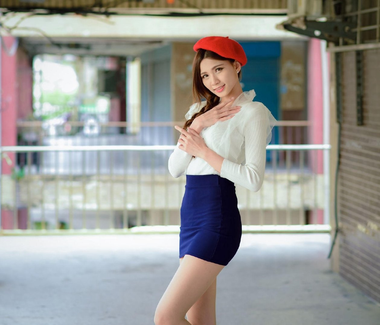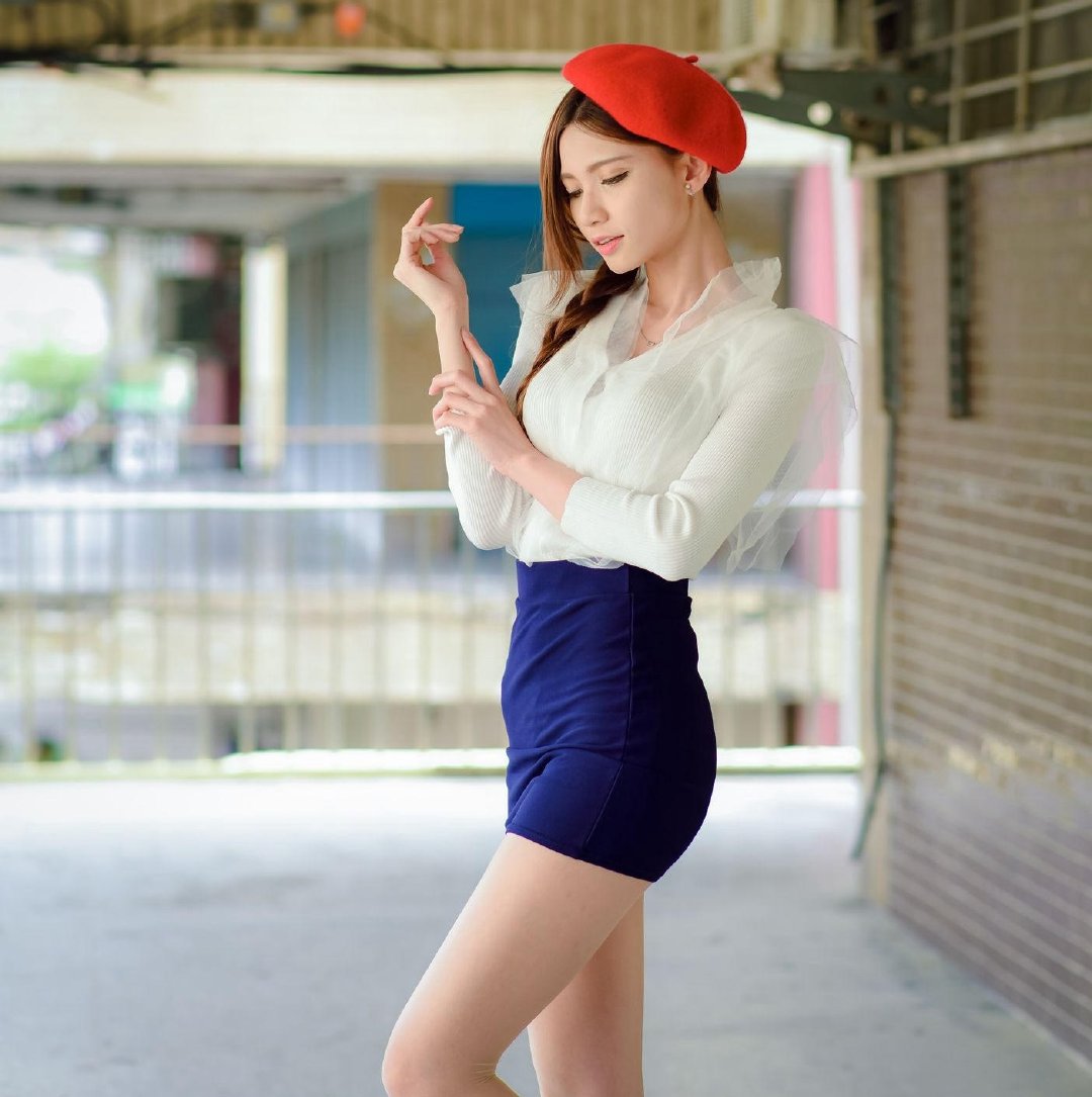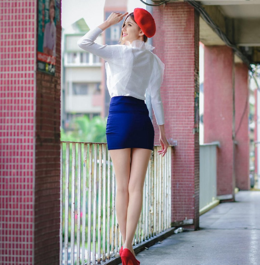 下搭一条吸睛的蓝色短裙,高腰的设计显得人特别地高挑迷人,简约的版型却轻松穿出时尚的感觉,脚上一双吸睛的红色高跟鞋与头上贝雷帽颜色一致,日常通勤很是时尚。