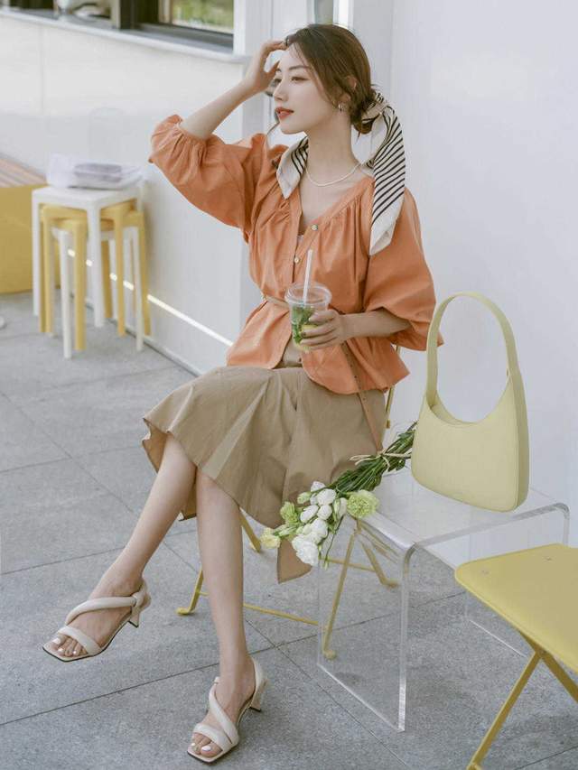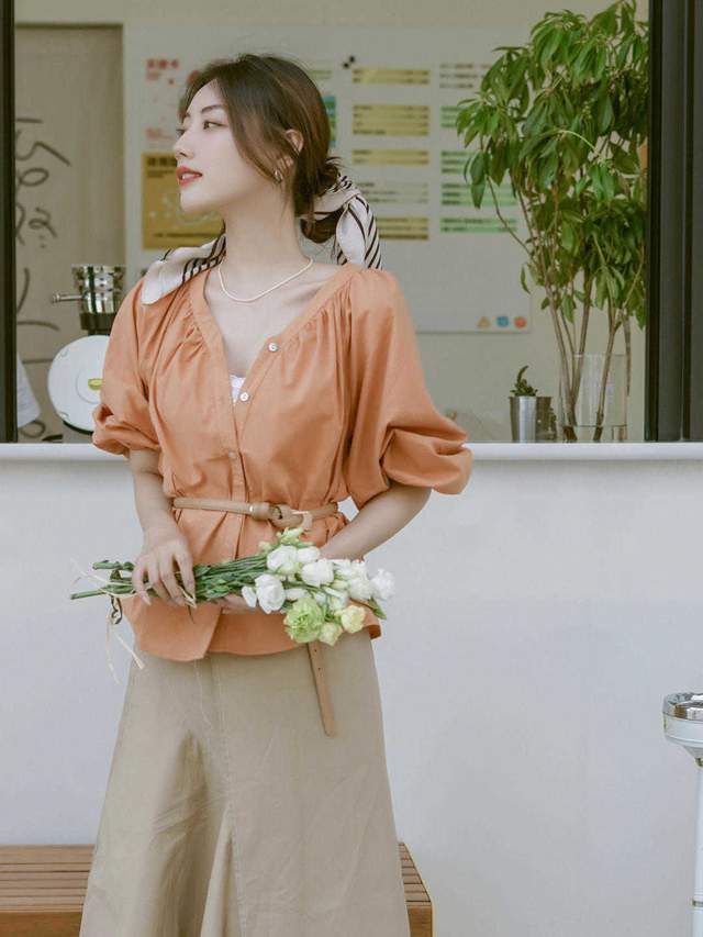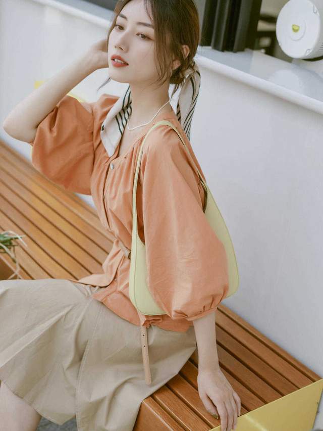 所以走精致和路线,就可以选择衬衫来穿搭就好了,可以像这位时尚博主,一个V领的衬衫,而且颜色也很鲜艳,这颜色应该是属于深橙色,而且V领能够打造的气质也很强大,特别是锁骨,以及利用的小心思,都完全掌握到了。