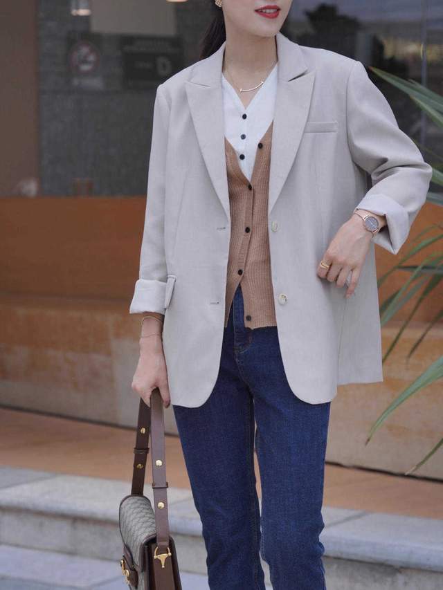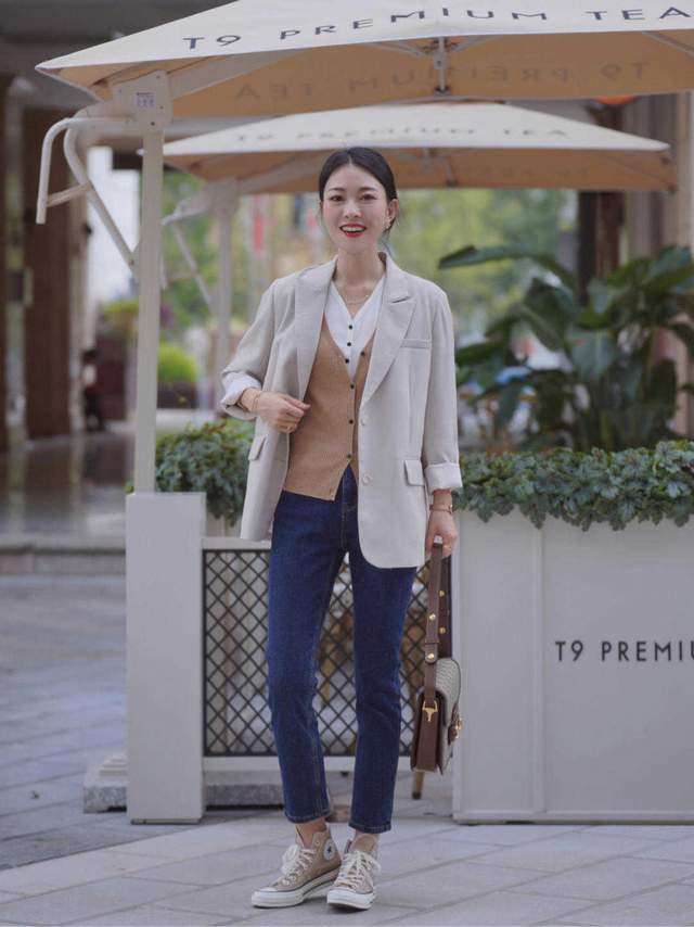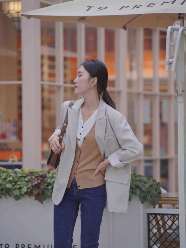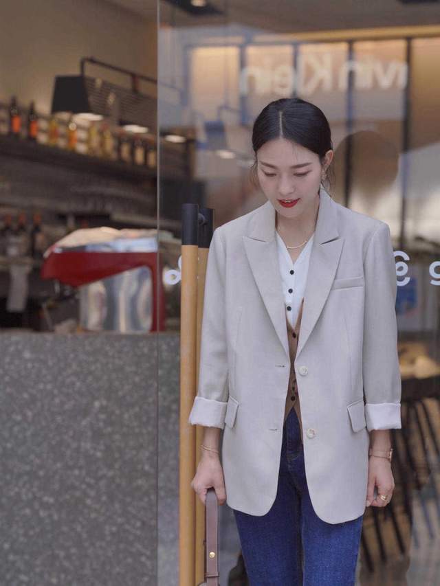 外面再搭配一件西服外套,一个米白色的西服外套,也会显得很纯粹和干净,然后裤子是选择的牛仔裤,虽然选择比较休闲的牛仔裤,也可以运用牛仔裤和西服混搭在一起,一种正式,一种休闲,反而也是一种不同的火花。